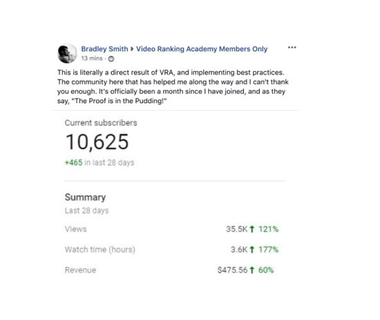 Video Ranking Academy isn’t designed to just be consumed—it’s designed to be applied. To help you apply the training to your YouTube platform, this course comes with interactive study guides and checklists. It also includes private access to a unique VRA Facebook group where you can discuss what you’re learning with other YouTubers who are trying to grow their YouTube presence. The course will provide you with a proven framework for ranking your videos, growing your audience, and turning views into income.